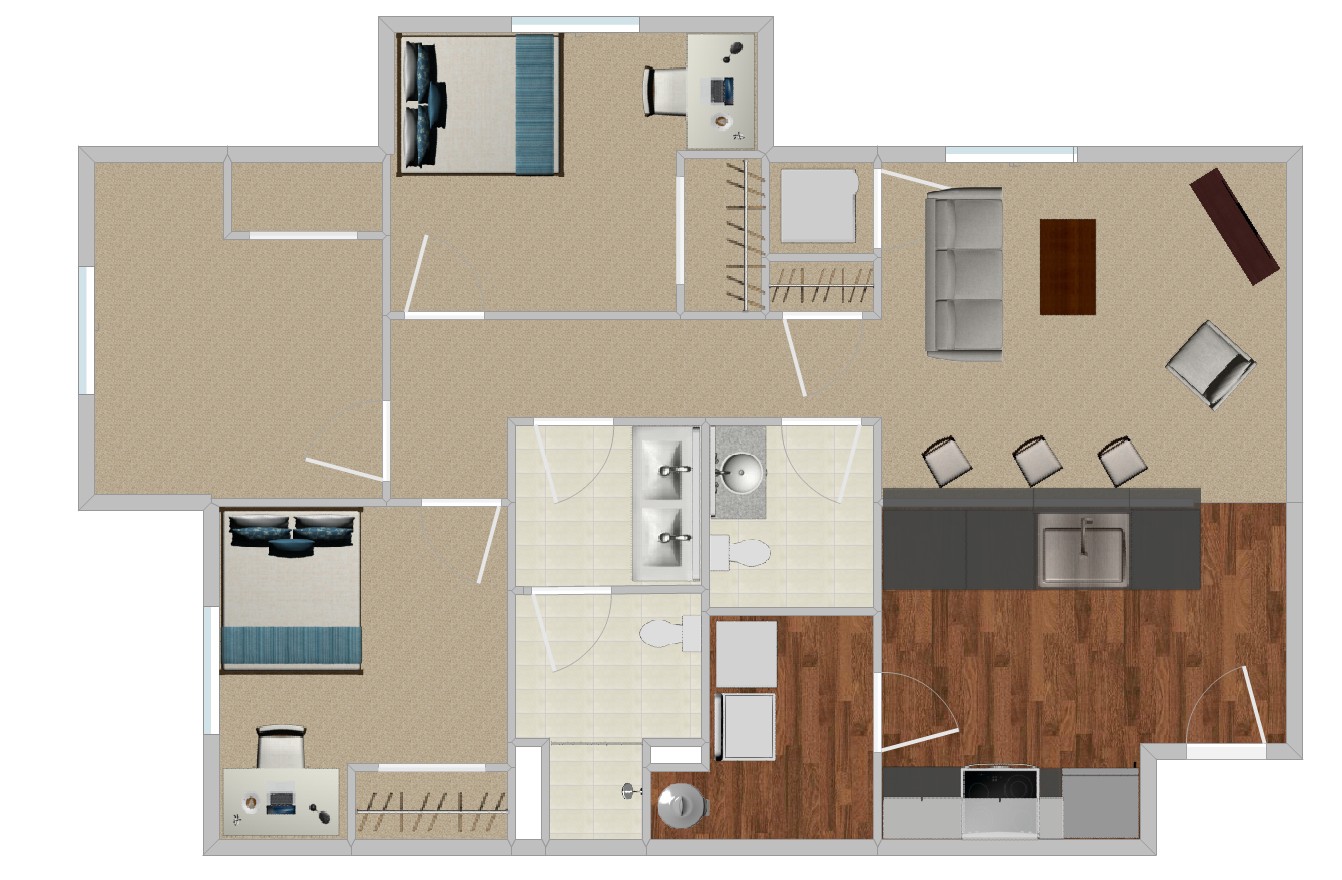 Two bedroom with one and a half shared bathrooms, laundry room and open bonus room to use as desired.